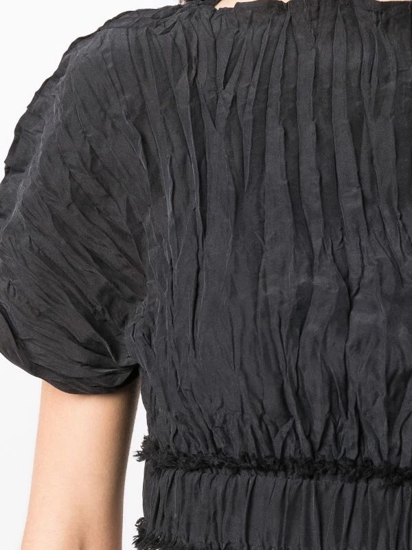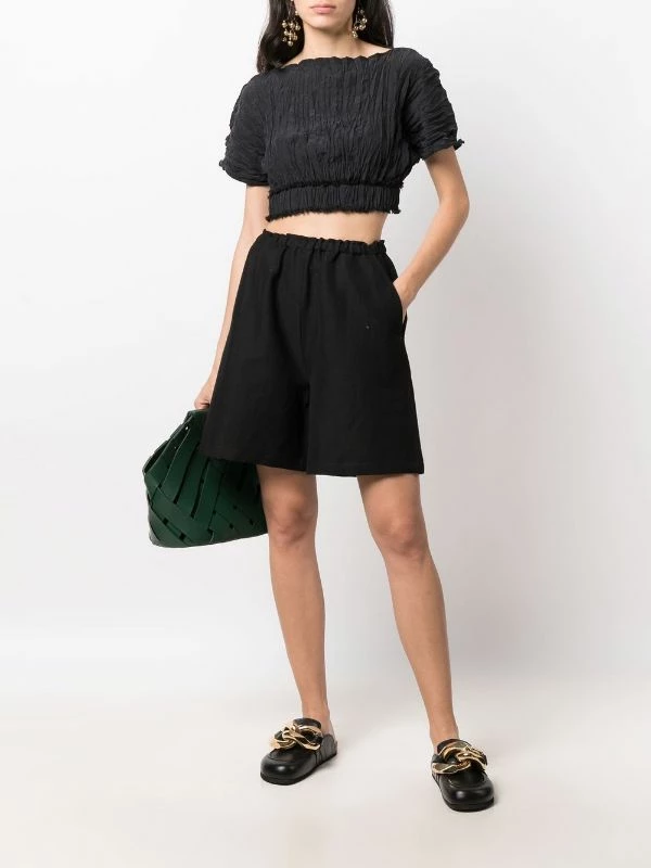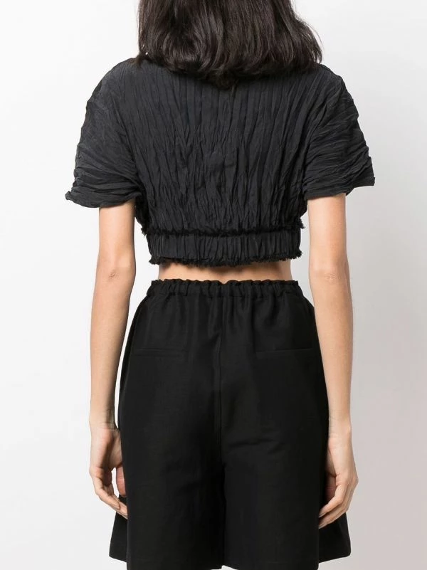 Totême impresses with its creative approach to texture and shape with this black silk top. Boasting a crinkled finish and a cropped length, this boat neck top pays homage to the brand’s experimental aesthetic.