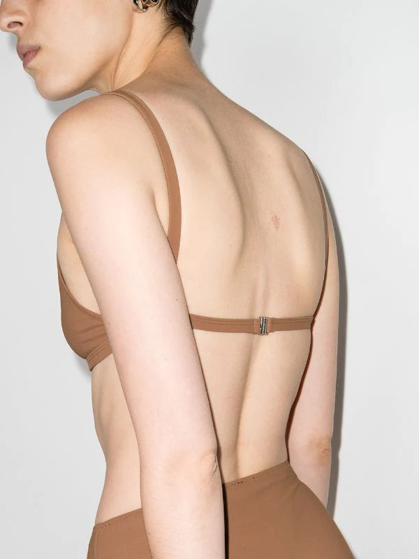Totême applies its minimalist energy to swimwear through this brown bikini top. Made from a quick-drying stretch jersey and recycled fibres, it is shaped with triangle cups and slender shoulder straps.