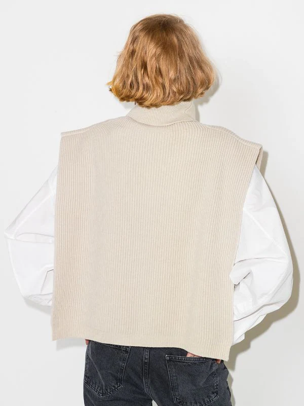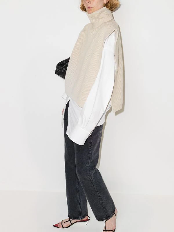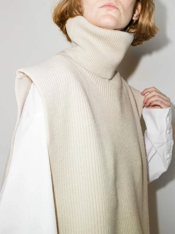 Cut with effortless clean lines, Totême’s cream-beige layer captures the Scandinavian brand’s minimalist approach. Rib-knitted from a soft lambswool blend, it features a roll neck and cut-out sleeves for easy styling.