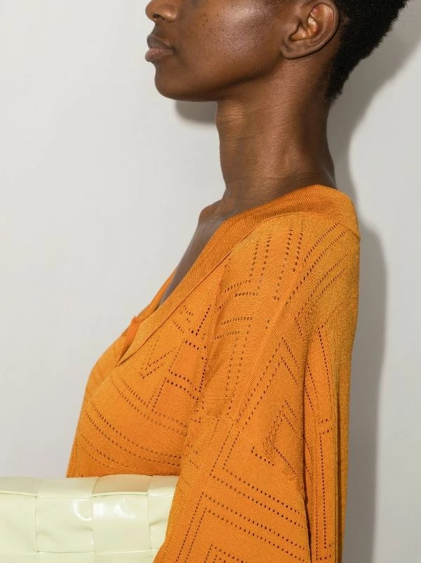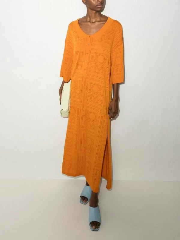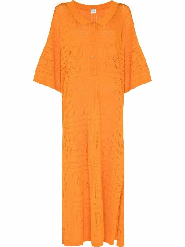 This orange midi dress from Toteme is highlighted by a monogram pointelle knit pattern. The piece is designed for an oversize fit and a wide silhouette and has a deep polo shirt collar with mother of pearl buttons.