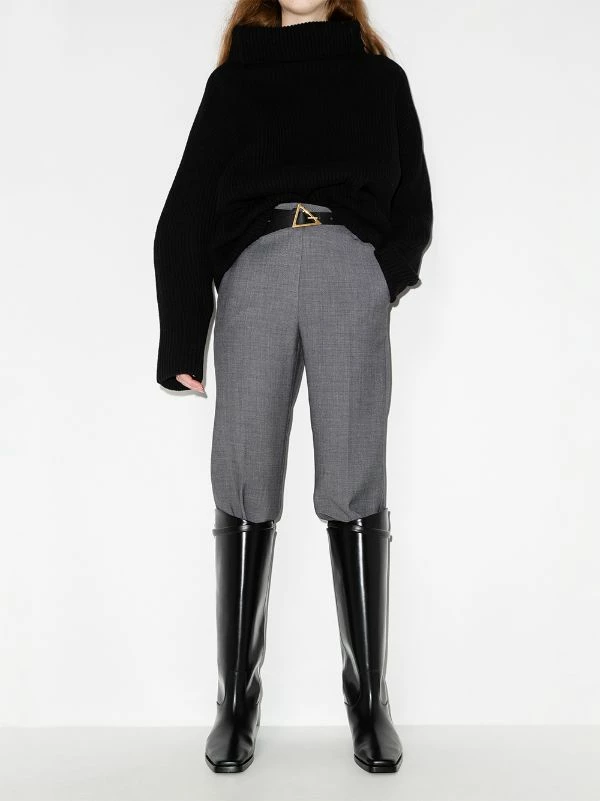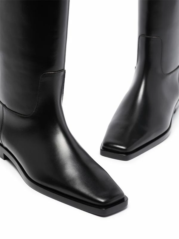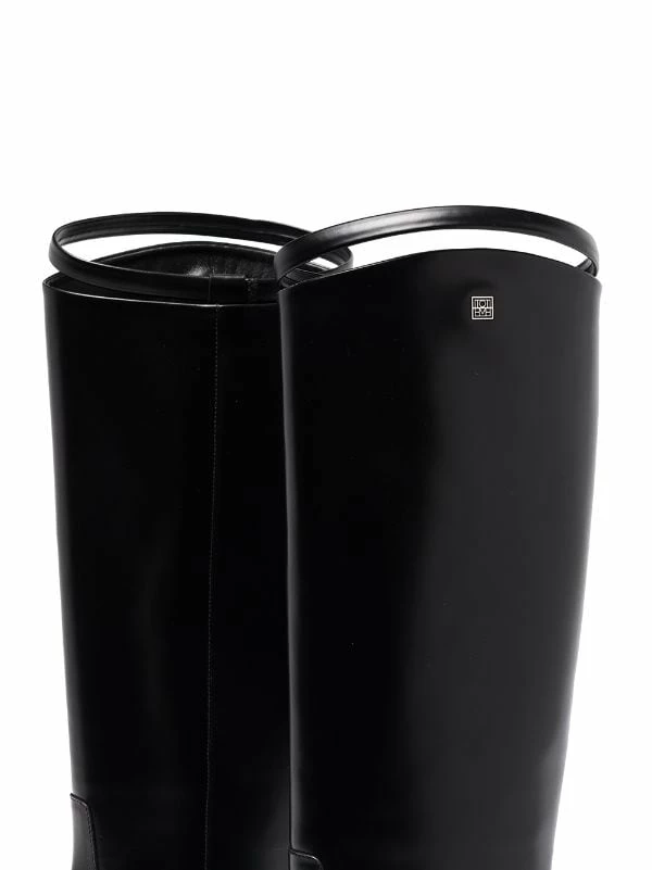 Totême’s understated approach to garments combined with its neutral tones palette creates refined and timeless pieces. Crafted from soft leather, these knee-high riding boots stand out due to their contemporary square toe and strap detail that seamlessly contrast with their classic silhouette.