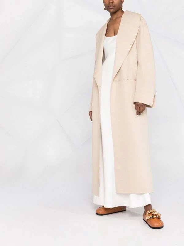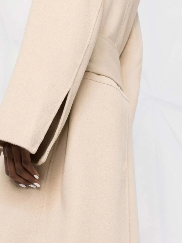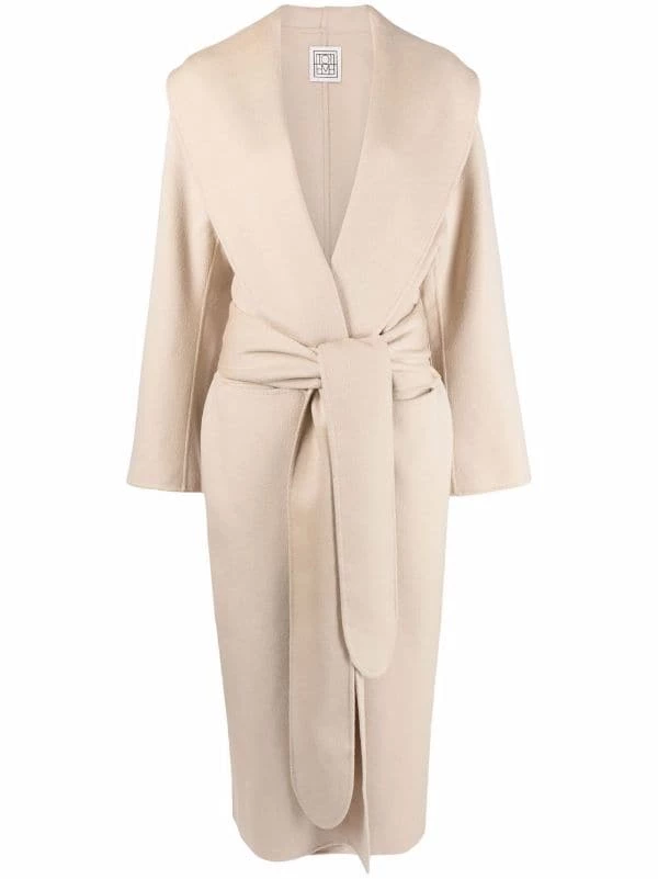 Toteme takes on a less is more approach with this long coat. Presented in a soft beige hue, this piece features an open front and a an adjustable tonal belt.
