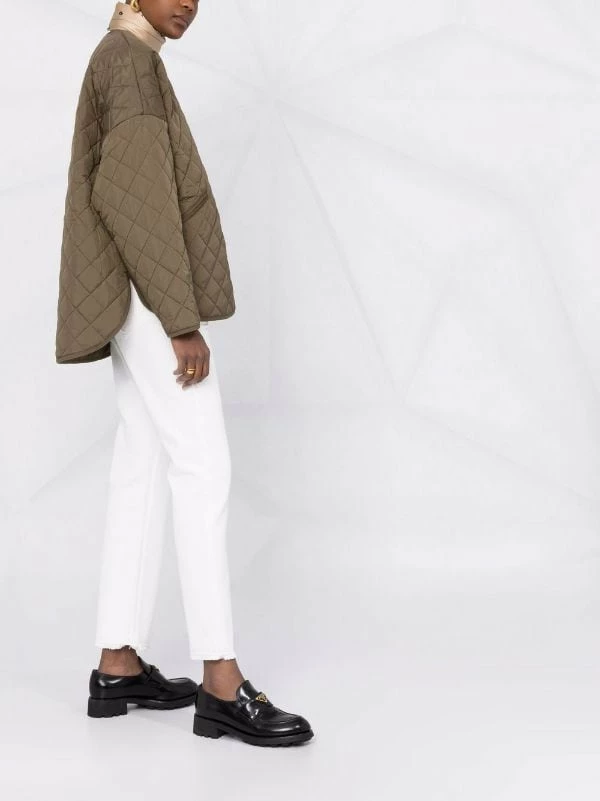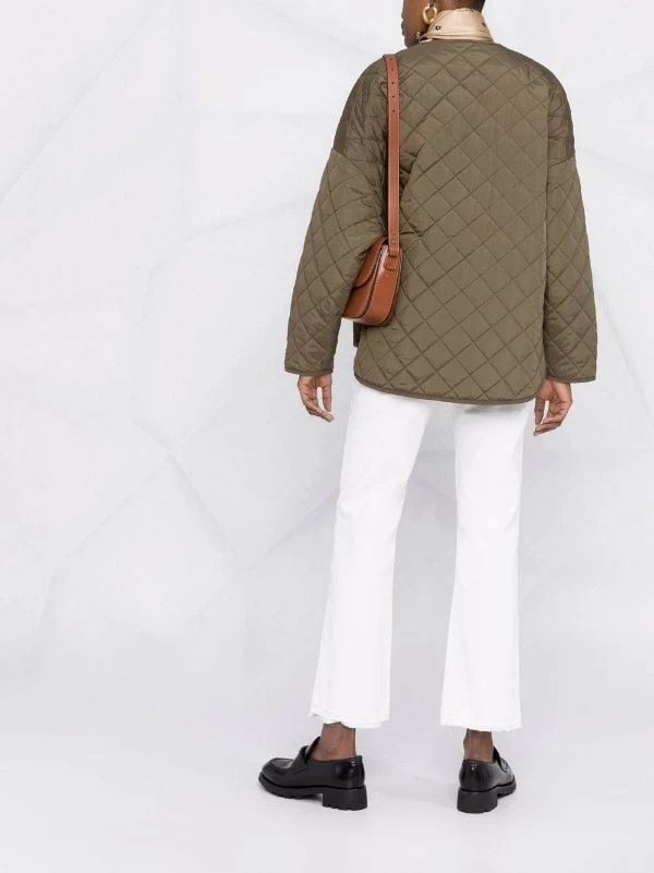 Stockholm-based Totême ‘explores the appeal of a modern uniform’ and does so using refined materials and classic lines. Sustainably crafted from recycled polyester, this military green jacket boasts a quilted finish that elevates its single-breasted and collarless silhouette.