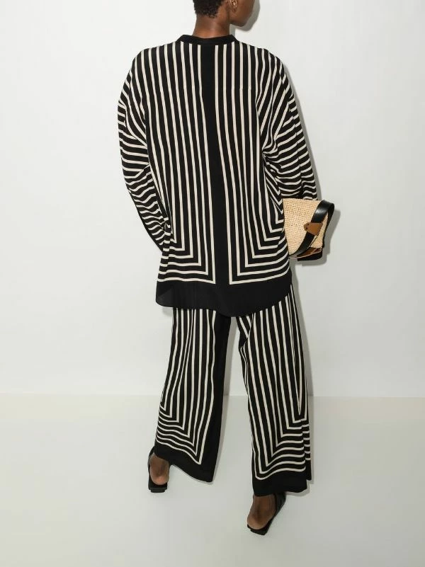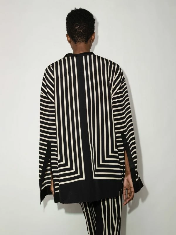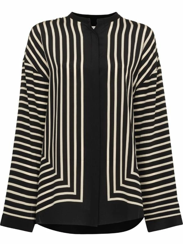 Designed to create a bold visual effect, this blouse from Toteme showcases an enticing geometric print. The piece’s collarless silhouette allows the distinctive motif to take the focus.