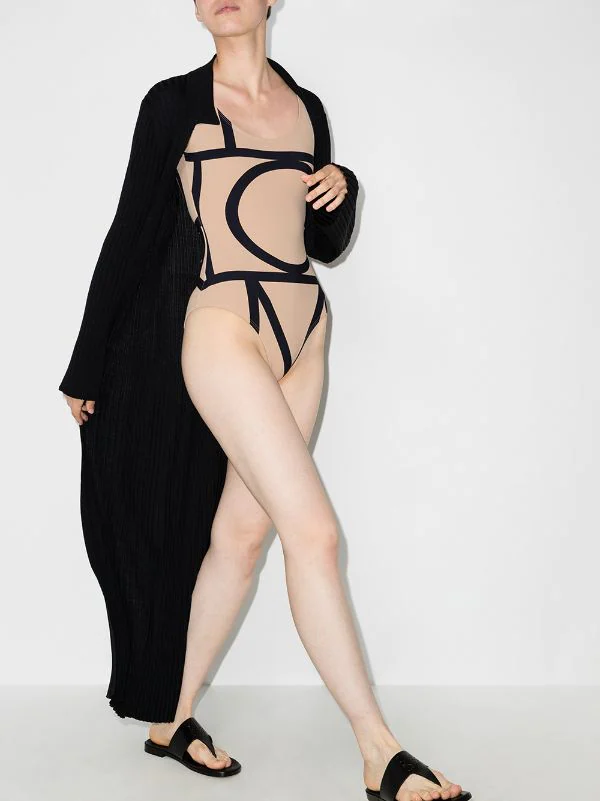Totême’s swimsuit is defined by the black signature monogram print that evokes a contemporary feel. Made in Portugal from a four-way stretch jersey with SPF 50, it is cut to a scoop-neck and high-cut legs silhouette.