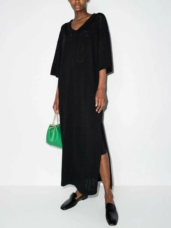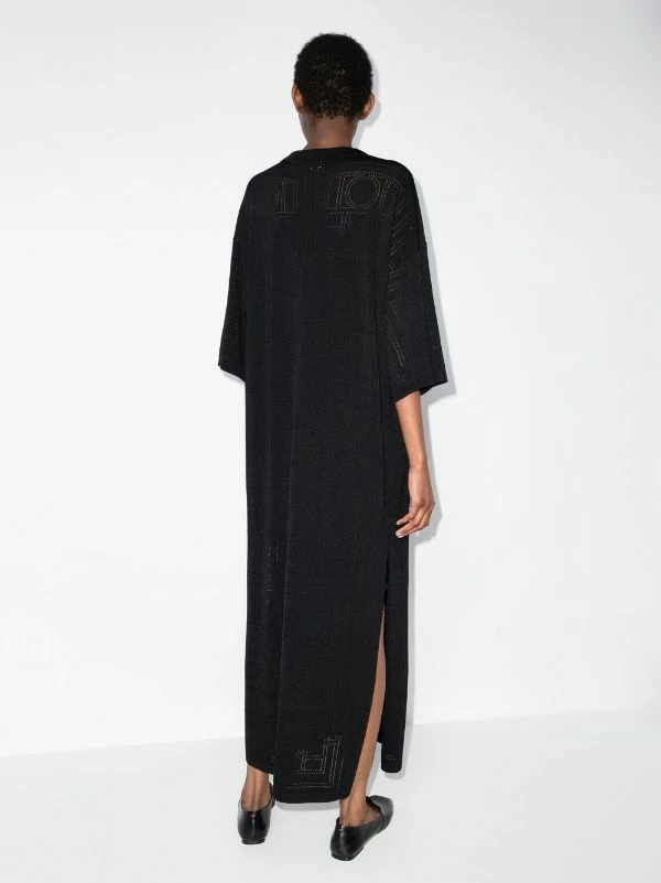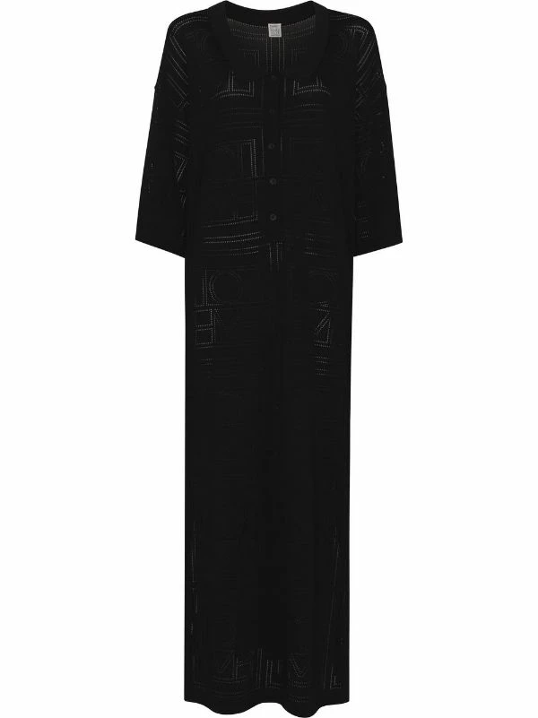 This black midi dress from Toteme is highlighted by a monogram pointelle knit pattern. The piece is designed for an oversize fit and a wide silhouette and has a deep polo shirt collar with mother of pearl buttons.