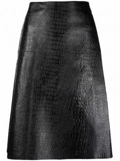 Toteme adds a twist to the traditional knee-length wrap skirt for its SS22 collection. With a side hook and eye fastening, it shows a crocodile-embossed effect on black lambskin.