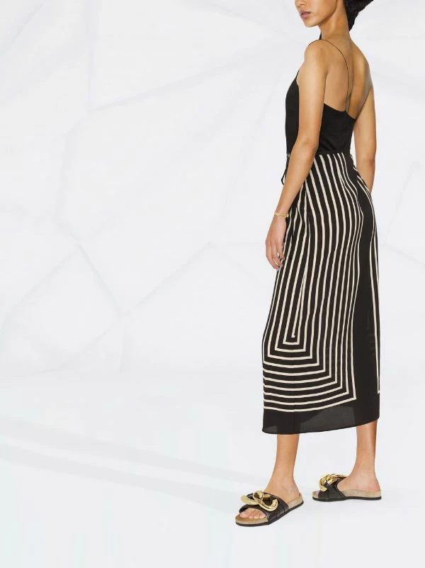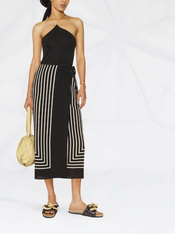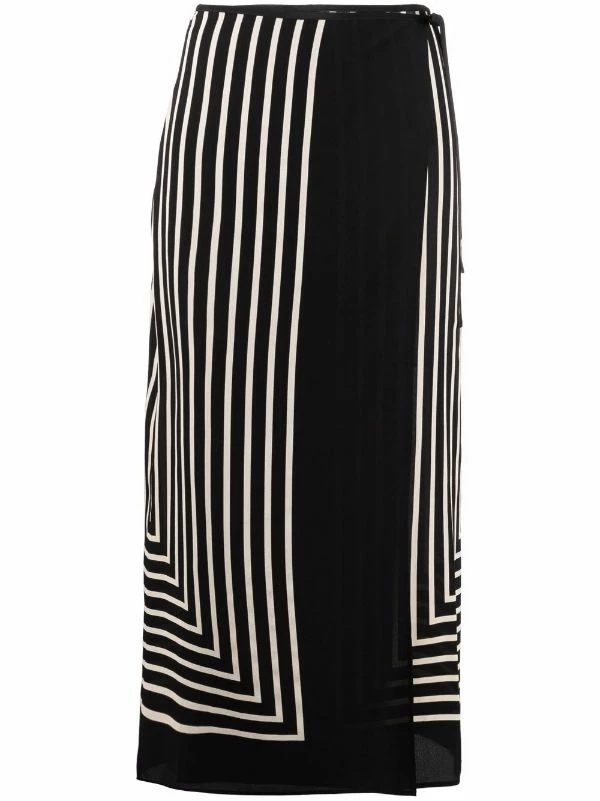 Utilising fine fabrics and classic silhouettes, Stockholm-based Totême offers a collection of versatile staples. This wrap skirt is crafted from silk and boasts a graphic striped print in black and white.